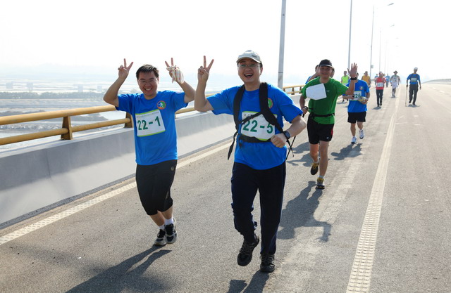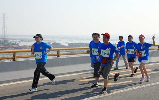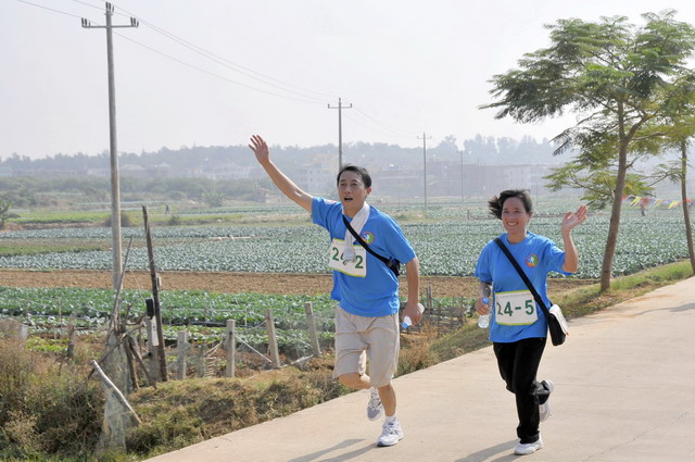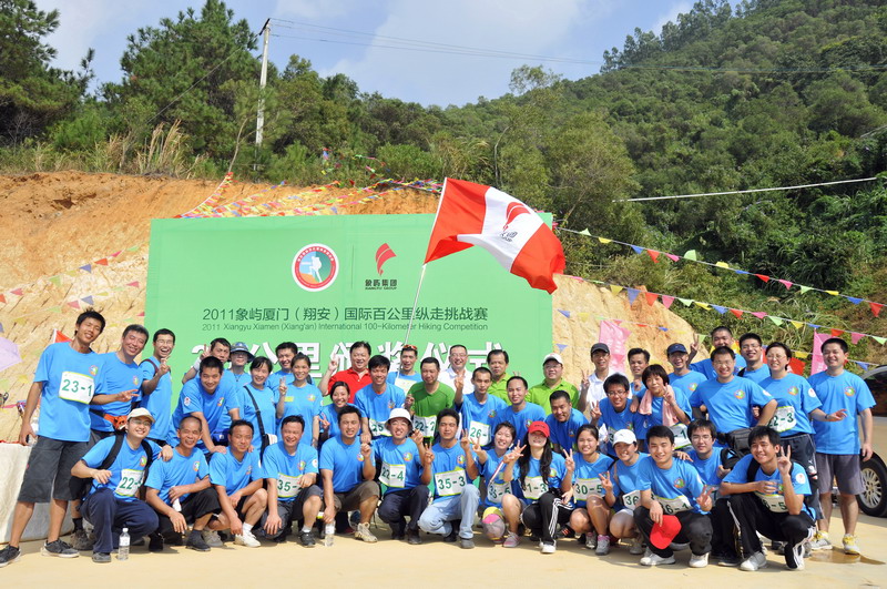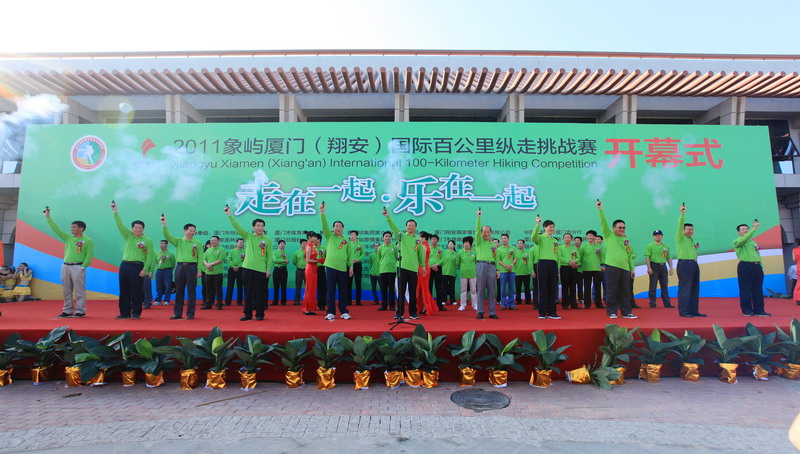 11月5日8時09分,明媚秋光里,廈門市委常委、副市長臧杰斌宣布2011象嶼廈門(翔安)國際百公里縱走挑戰(zhàn)賽開始,廈門市人大常委會副主任黃杰成、廈門市政協(xié)副主席陳昌生、國家奧林匹克體育中心副主任彭維勇、象嶼集團(tuán)總裁張水利等一起為比賽鳴槍。來自28個國家和地區(qū)的近萬名運(yùn)動愛好者,從大嶝小鎮(zhèn)·臺灣免稅公園廣場出發(fā),穿越田野、海濱、山巒、閩南古厝,開始了一段挑戰(zhàn)自我的征途。這其中,由象嶼集團(tuán)員工及家屬、合作伙伴、共建單位等組成的千人象嶼團(tuán)隊(duì)分外引人注目,浩浩蕩蕩的象嶼人走在一起、樂在一起,在欣賞沿途自然、人文風(fēng)光的同時,也享受著挑戰(zhàn)自我、永不止步的健康向上,享受著與同事、親朋共度美好秋假的怡然歡樂。