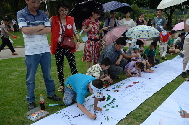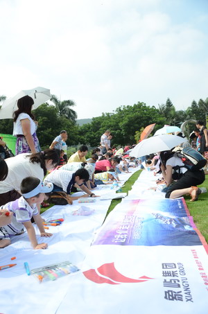 在歡樂的開場熱身舞蹈后,每位小朋友在家長的幫助下,從“讓世界充滿愛”、“我們的海洋朋友”、“小小環(huán)保家”三個(gè)繪畫主題中選取一個(gè),在預(yù)先準(zhǔn)備好的白色長卷上,將自己對(duì)愛護(hù)海洋、保護(hù)環(huán)境、互幫友愛的理解通過一支支水彩筆繪諸紙上,通過一幅幅可愛的圖畫,表達(dá)他們對(duì)公益的關(guān)注和認(rèn)識(shí),與其他的象嶼“雛鷹”們一起,提前度過了一個(gè)非常有意義的“六一”兒童節(jié)。
