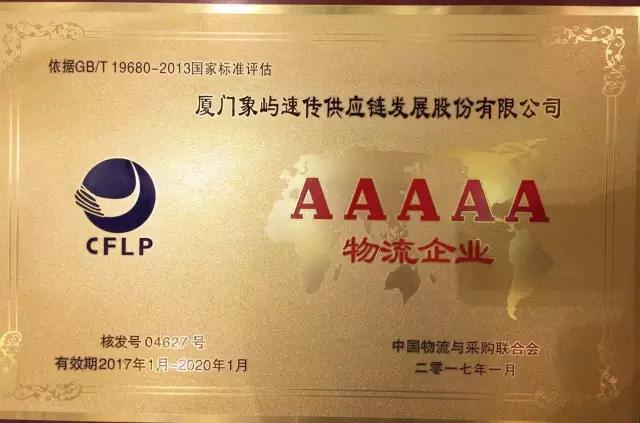 4月7日,由中國物流與采購聯(lián)合會主辦的“物流企業(yè)授牌大會暨物流業(yè)創(chuàng)新發(fā)展論壇”在云南省昆明市順利召開,會議對本批A級物流企業(yè)進行了集中授牌,象嶼速傳供應鏈發(fā)展股份有限公司榮膺最高評級國家AAAAA級綜合服務型物流企業(yè),成為象嶼旗下繼象嶼股份后第二家獲此殊榮的企業(yè)。