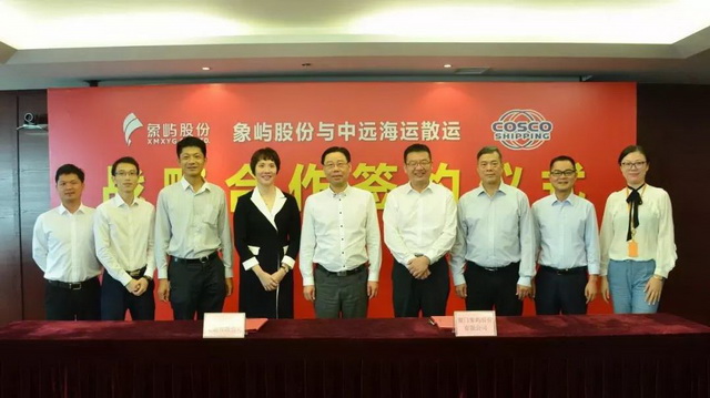 8月3日,廈門象嶼股份有限公司與中遠(yuǎn)海運(yùn)散貨運(yùn)輸有限公司舉行戰(zhàn)略合作協(xié)議簽署儀式。象嶼股份黨委書記、總經(jīng)理鄧啟東、中遠(yuǎn)海運(yùn)散運(yùn)黨委副書記、總經(jīng)理?xiàng)钪緢?jiān)分別代表雙方公司在戰(zhàn)略合作協(xié)議上簽字,象嶼股份副總經(jīng)理、象嶼速傳總經(jīng)理肖靜勤、中遠(yuǎn)海運(yùn)散運(yùn)營銷中心總監(jiān)謝光盛等領(lǐng)導(dǎo)出席了簽約儀式。